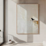 Pintura minimalista que presenta la delicada silueta de un pájaro negro posado sobre una superficie texturada en tonos neutros y suaves. La composición evoca una sensación de calma, contemplación y melancolía poética. Ideal para espacios que buscan un toque artístico sutil y evocador, con una estética natural y serena. Perfecta para complementar ambientes de diseño minimalista y escandinavo.