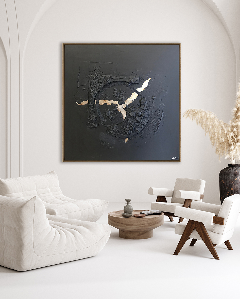 Una obra abstracta impactante con una superficie texturizada en negro y acentos geométricos audaces. Ideal para espacios modernos y oficinas, aportando profundidad y sofisticación a interiores contemporáneos.