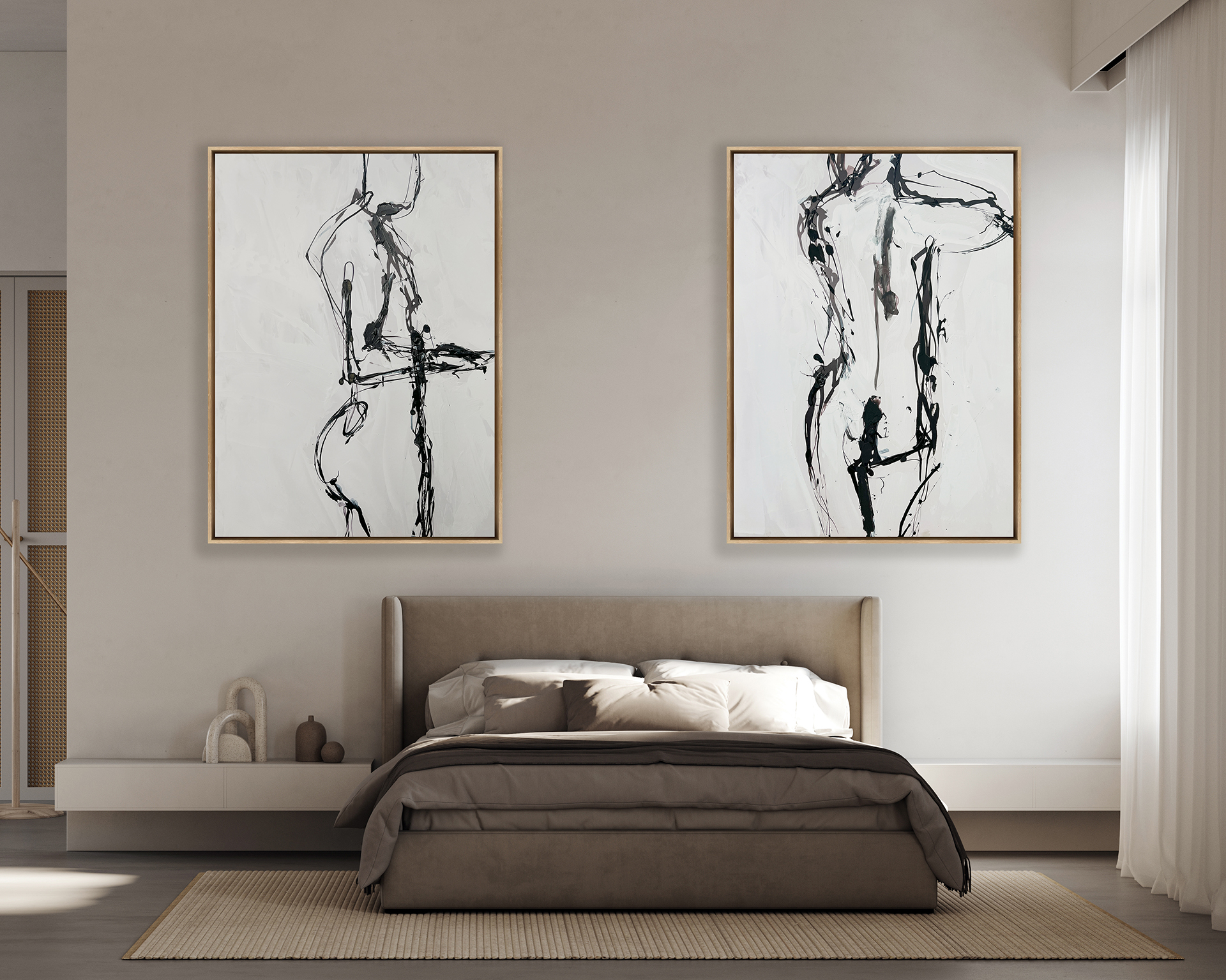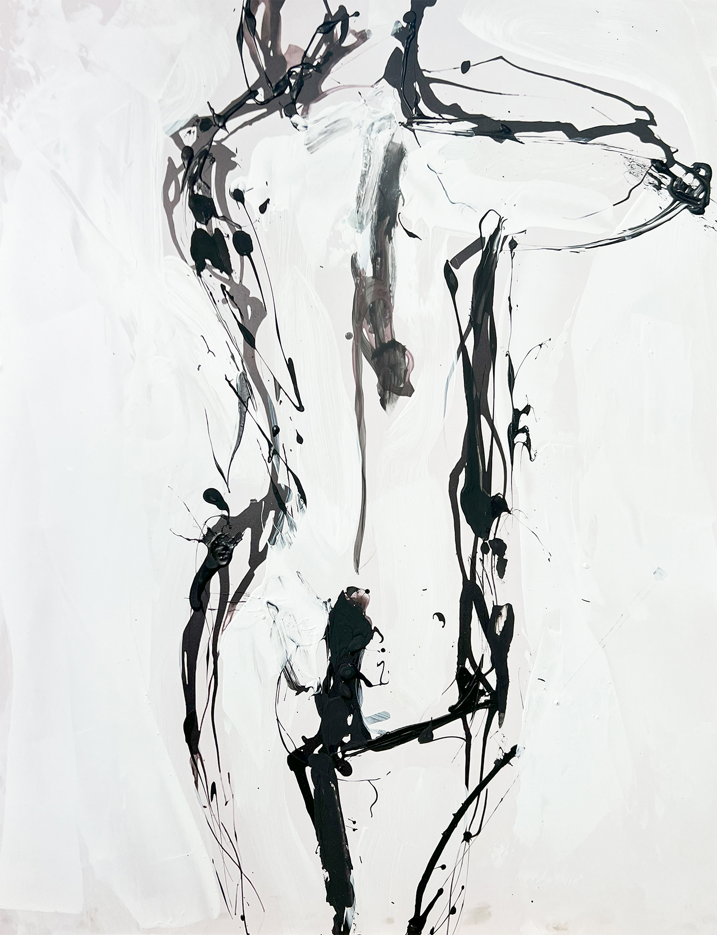 Obra abstracta que interpreta la forma del cuerpo humano a travs de l¡neas gestuales y expresivas manchas de tinta negra sobre un fondo blanco. La energ¡a del trazo y la sugerencia de la anatom¡a crean una pieza moderna y con un impacto visual din mico. Ideal para espacios que buscan un acento art¡stico contempor neo y minimalista con una exploraci¢n de la figura. Perfecta para complementar ambientes de dise¤o moderno y con car cter.