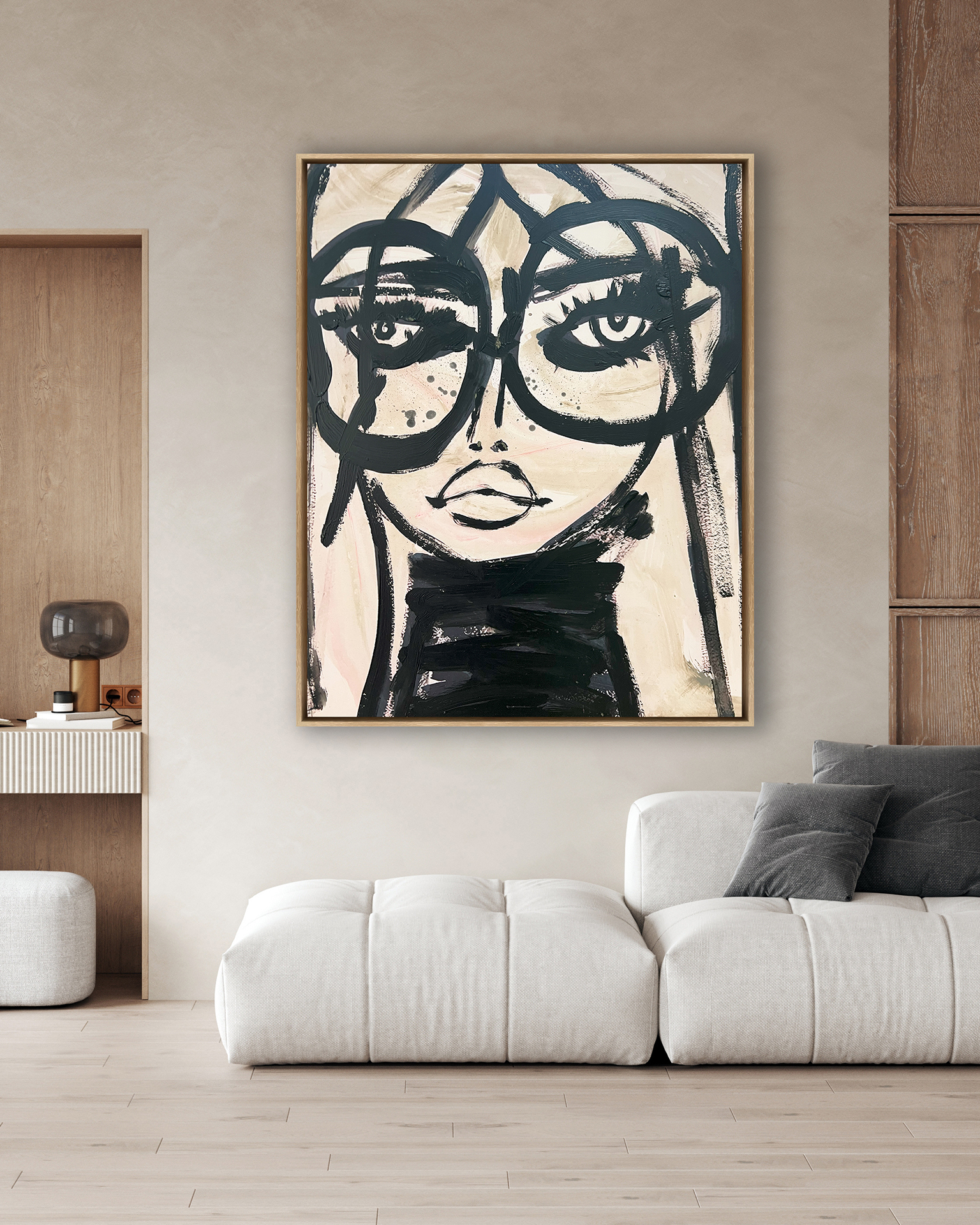 Obra pict¢rica abstracta que presenta un rostro femenino estilizado con gafas de gran montura en negro intenso, contrastando con un fondo en tonos neutros y sutiles toques de color. La pincelada expresiva y los detalles texturados aportan modernidad y sofisticaci¢n a la composici¢n. Ideal para espacios que buscan una pieza figurativa con un toque art¡stico contempor neo y distintivo. Perfecta para complementar ambientes de dise¤o moderno y con personalidad.