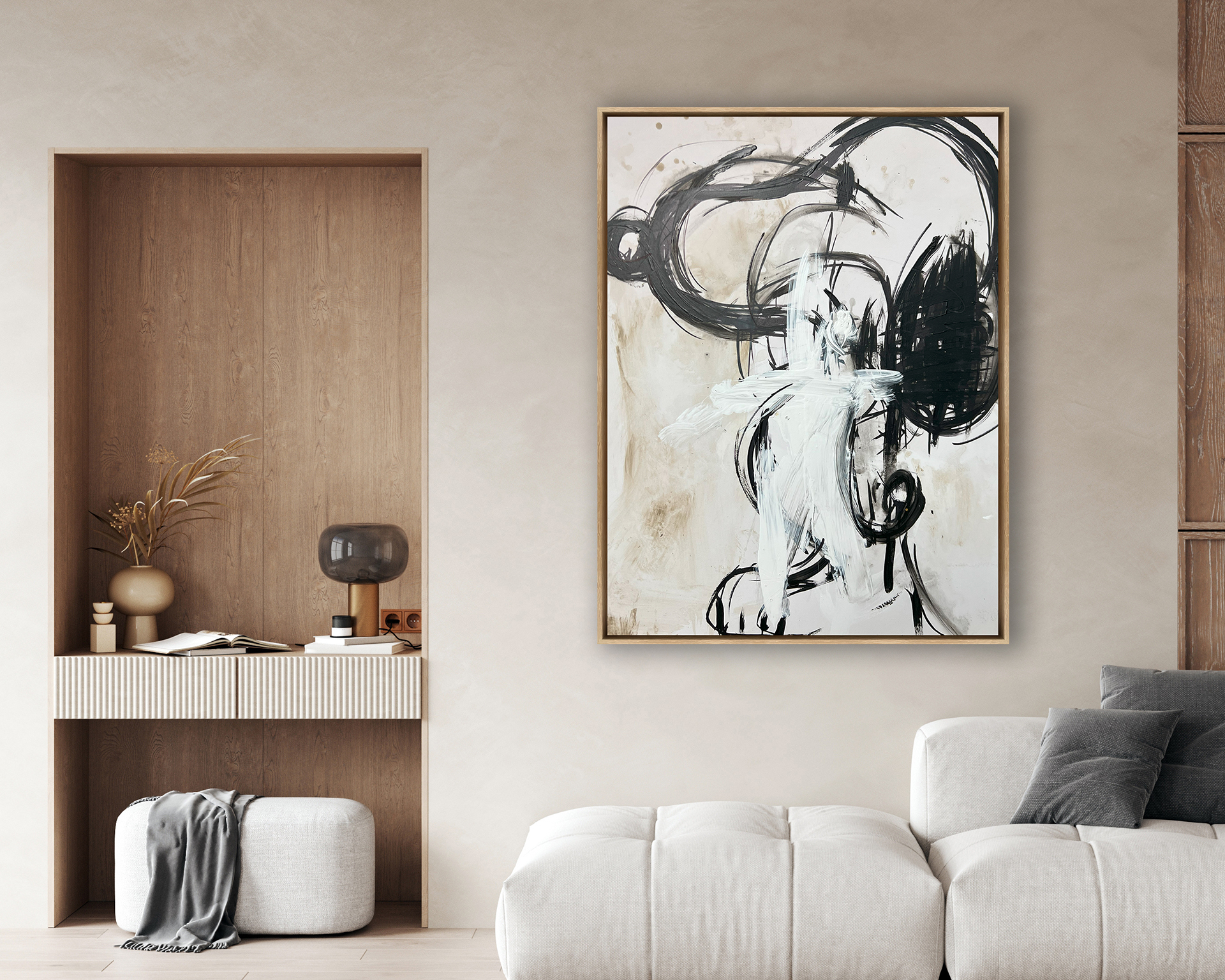 Obra abstracta inspirada en el personaje Snoopy, de gran fuerza visual, compuesta por trazos negros enrgicos y gestos blancos superpuestos sobre fondo neutro. El contraste entre control y caos transmite intensidad emocional y una esttica contempor nea. Ideal para interiores minimalistas, oficinas de dise¤o o espacios que apuestan por el arte conceptual con car cter.