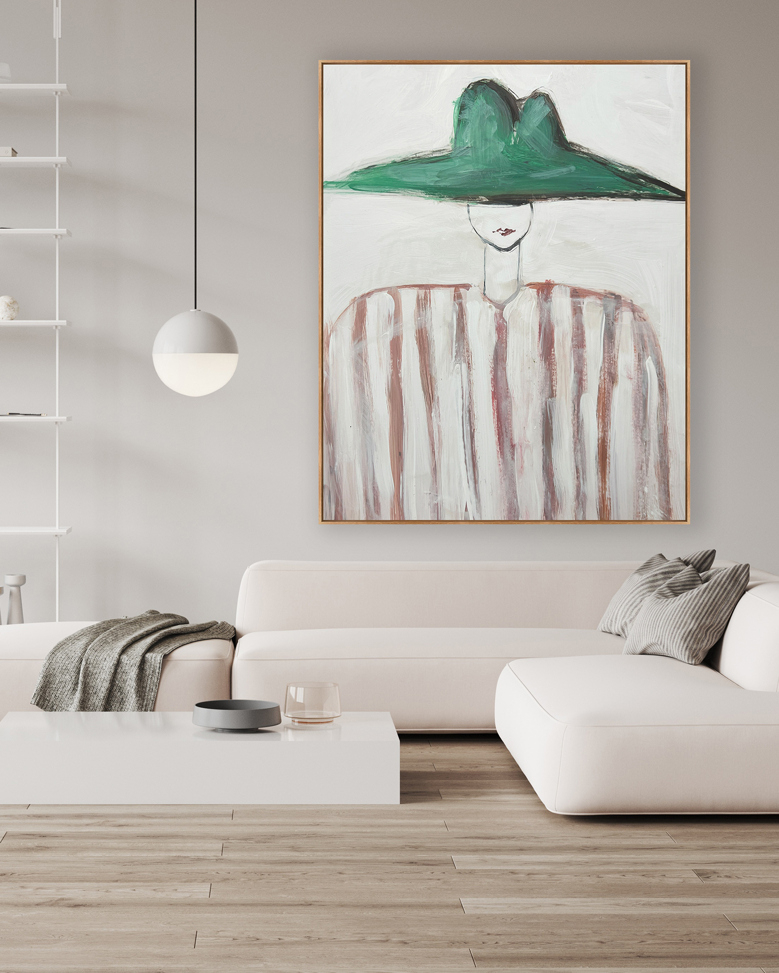 Obra pict¢rica moderna que presenta una figura estilizada con un llamativo sombrero verde de ala ancha y un cuerpo con pinceladas verticales en tonos neutros y rojizos. La composici¢n minimalista y la paleta de colores distintiva evocan una sensaci¢n de elegancia y sofisticaci¢n art¡stica. Ideal para espacios que buscan una pieza figurativa con un toque contempor neo y distintivo. Perfecta para complementar ambientes de dise¤o moderno y con personalidad.