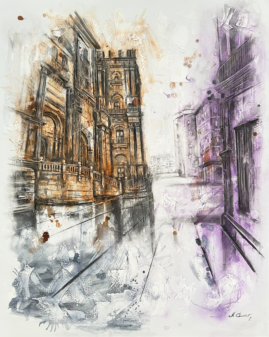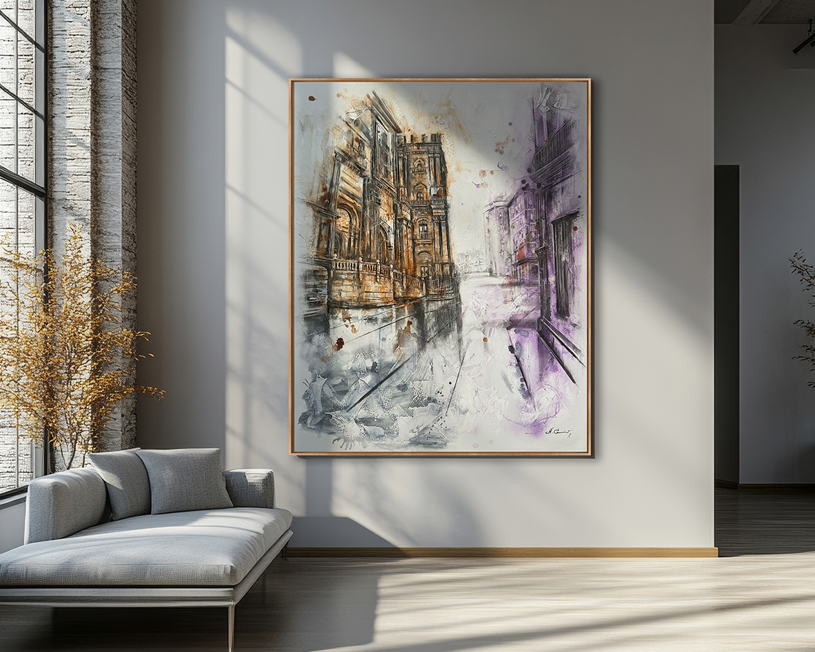 Descubre ‘Tarsel’, una obra que fusiona la arquitectura urbana con una paleta de color evocadora. Esta pieza presenta una composición dividida, donde los tonos ocre y sepia del lado izquierdo, con detalles constructivos, contrastan con los suaves morados y el juego de luces y sombras del lado derecho, que sugiere la profundidad de una calle. La técnica acuarelada aporta una ligereza y fluidez excepcionales. Ideal para decoradores y diseñadores de interiores que buscan piezas que evoquen paisajes urbanos con un toque artístico y sofisticado, aportando profundidad y una narrativa visual única a sus proyectos.