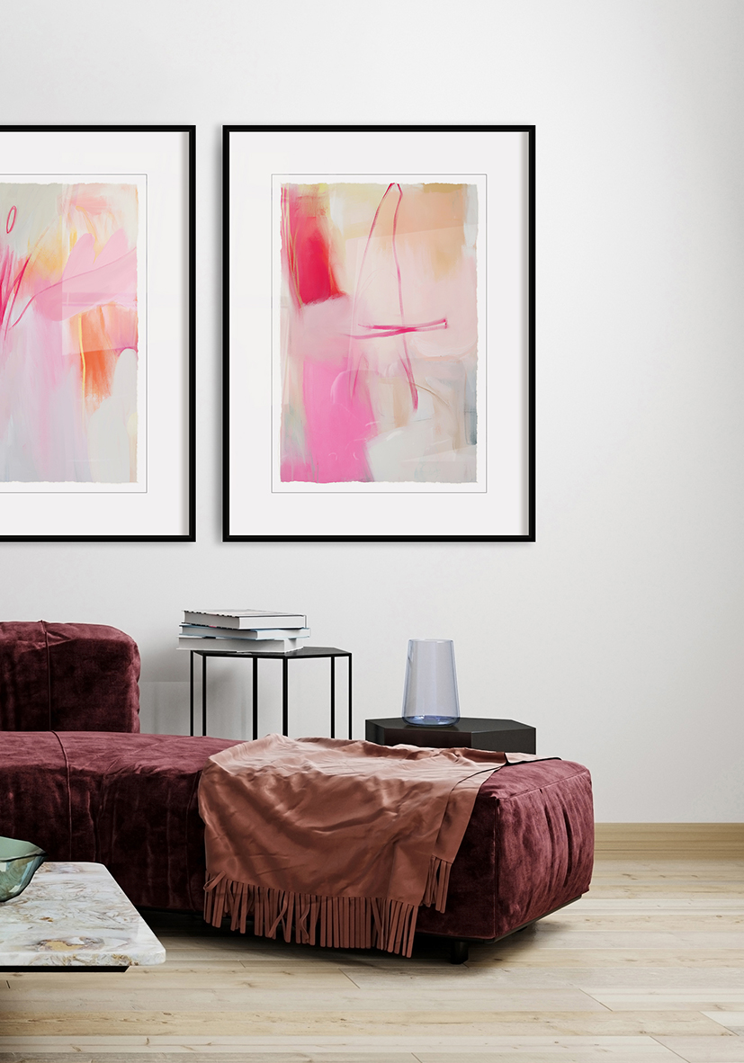 Obra abstracta con tonos vibrantes de rosa y beige, pinceladas suaves y líneas dinámicas. Aporta elegancia y carácter a espacios contemporáneos o ambientes modernos.
