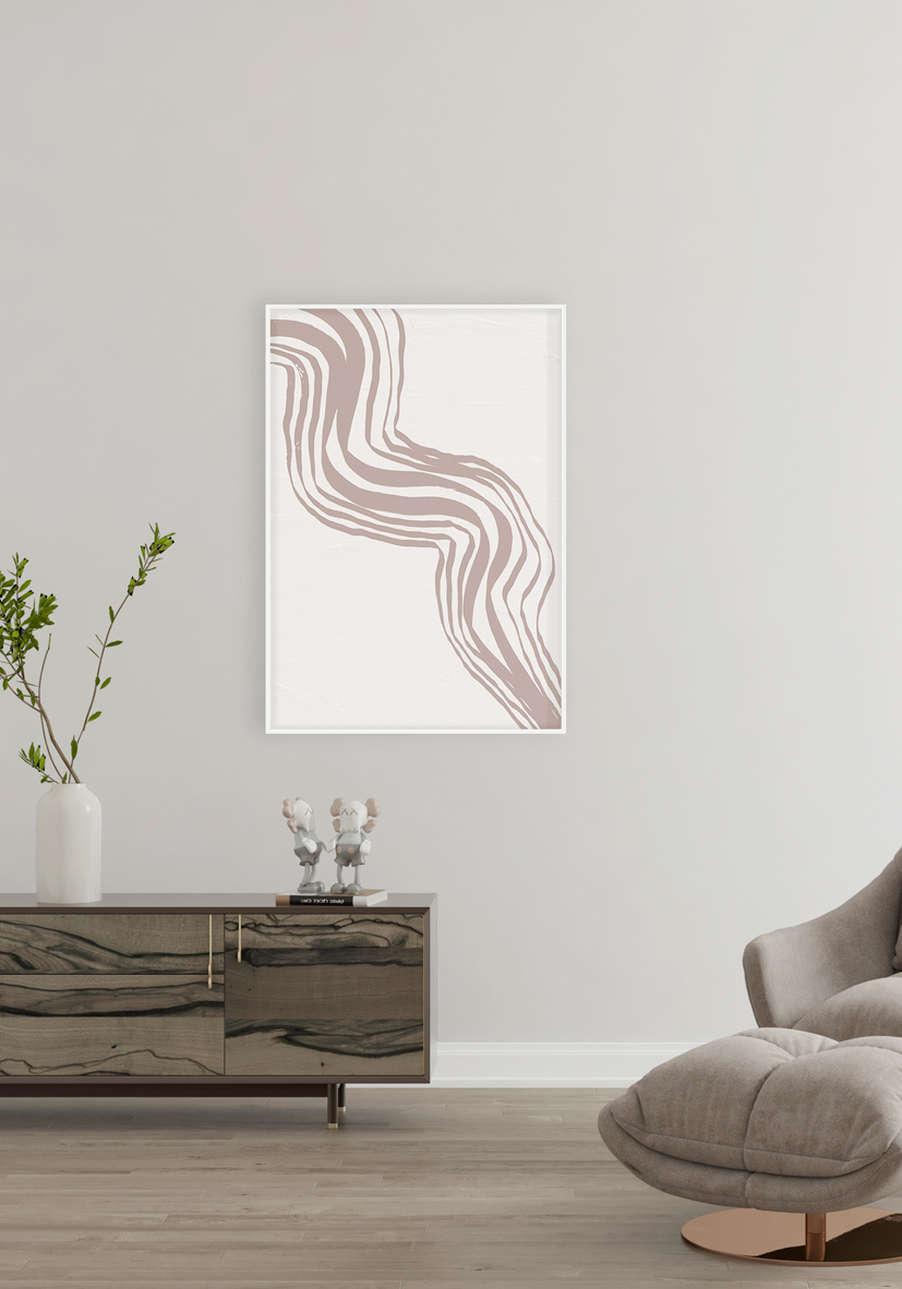 Arte minimalista con líneas curvas en suaves tonos marrones sobre un fondo beige texturizado, evocando fluidez natural y estética orgánica. Perfecta para interiores modernos y aficionados al arte contemporáneo.