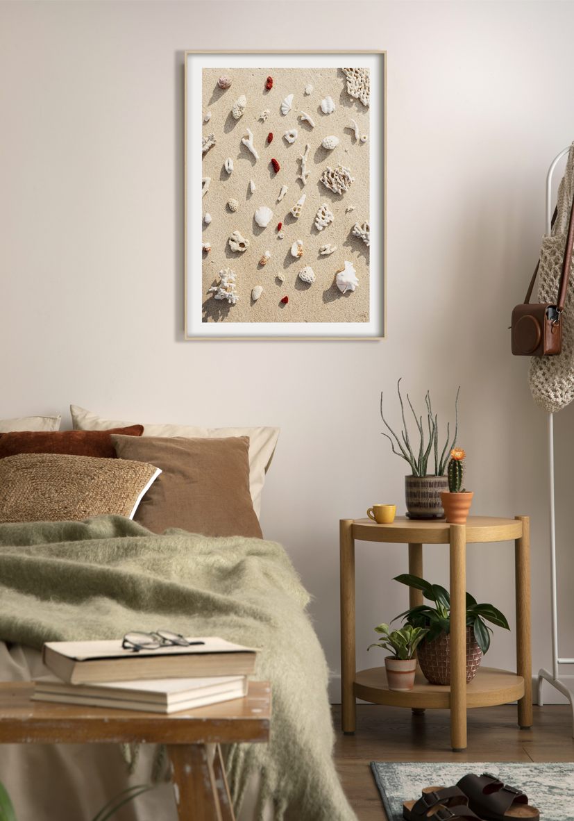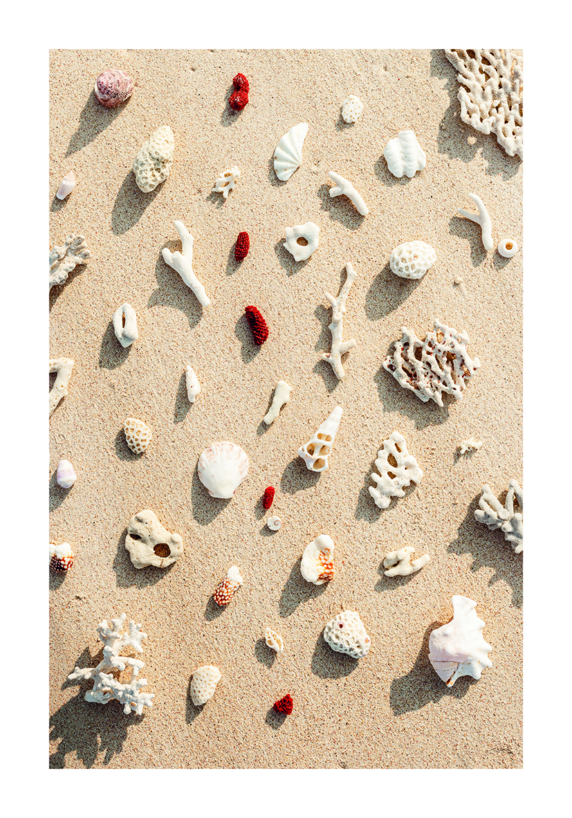 Conchas marinas y fragmentos de coral esparcidos sobre arena dorada, creando un patrón sereno y natural. Perfecta para espacios con estilo costero, tropical o inspiración orgánica.