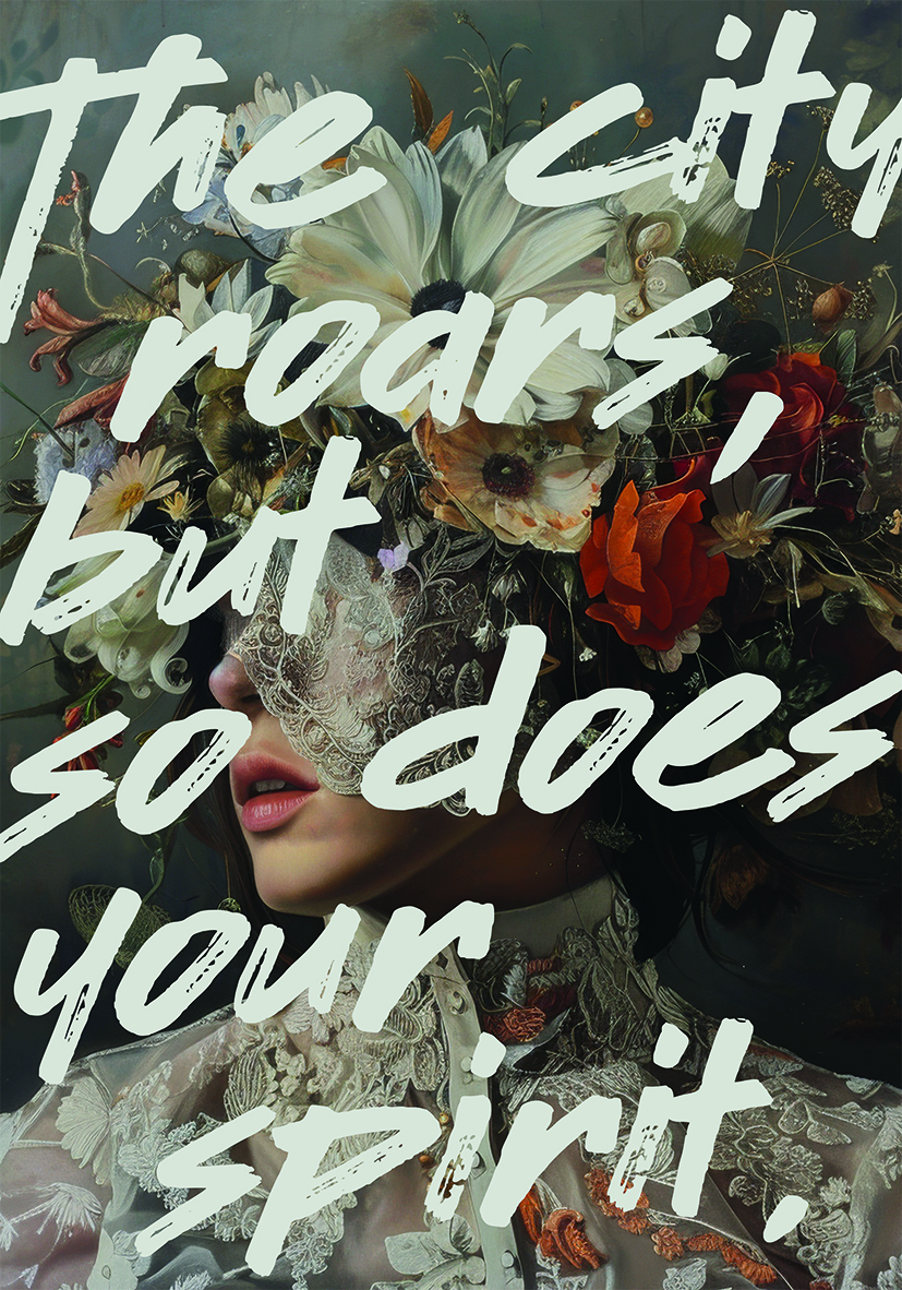 Representación artística con detalles florales intrincados sobre el rostro de una mujer, acompañada de una frase motivacional. Combina colores vivos y tipografía moderna para una estética inspiradora y vibrante.