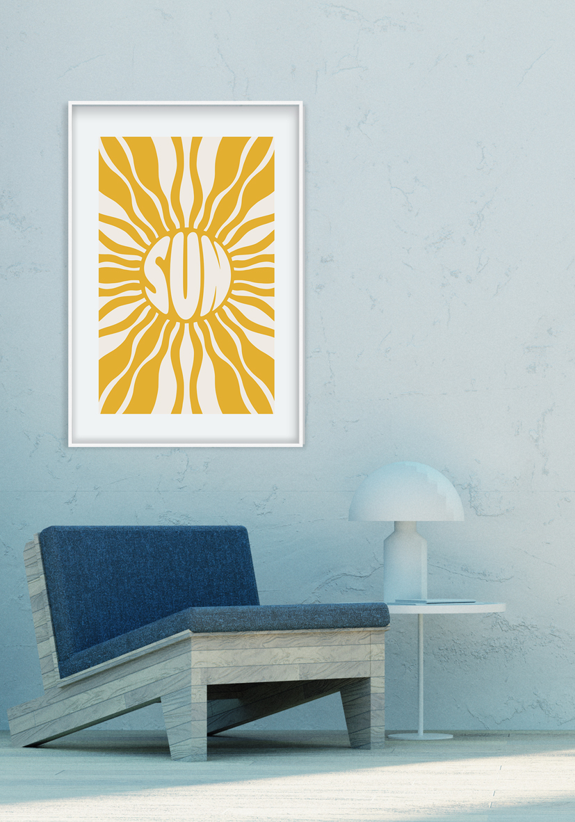 Lámina decorativa de estilo gráfico con un sol central y rayos en tonos amarillos. Un diseño potente y luminoso que aporta calidez visual y un punto artístico a salones modernos, dormitorios o espacios de inspiración veraniega.
