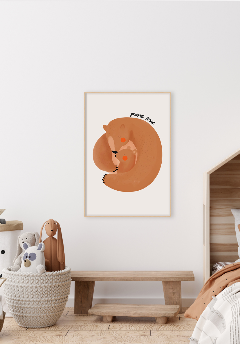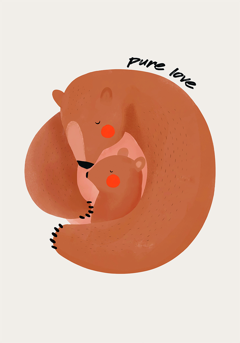 Adorable ilustración de un oso adulto abrazando a su osezno, símbolo de amor, protección y vínculos familiares, en tonos tierra acogedores sobre fondo claro minimalista.