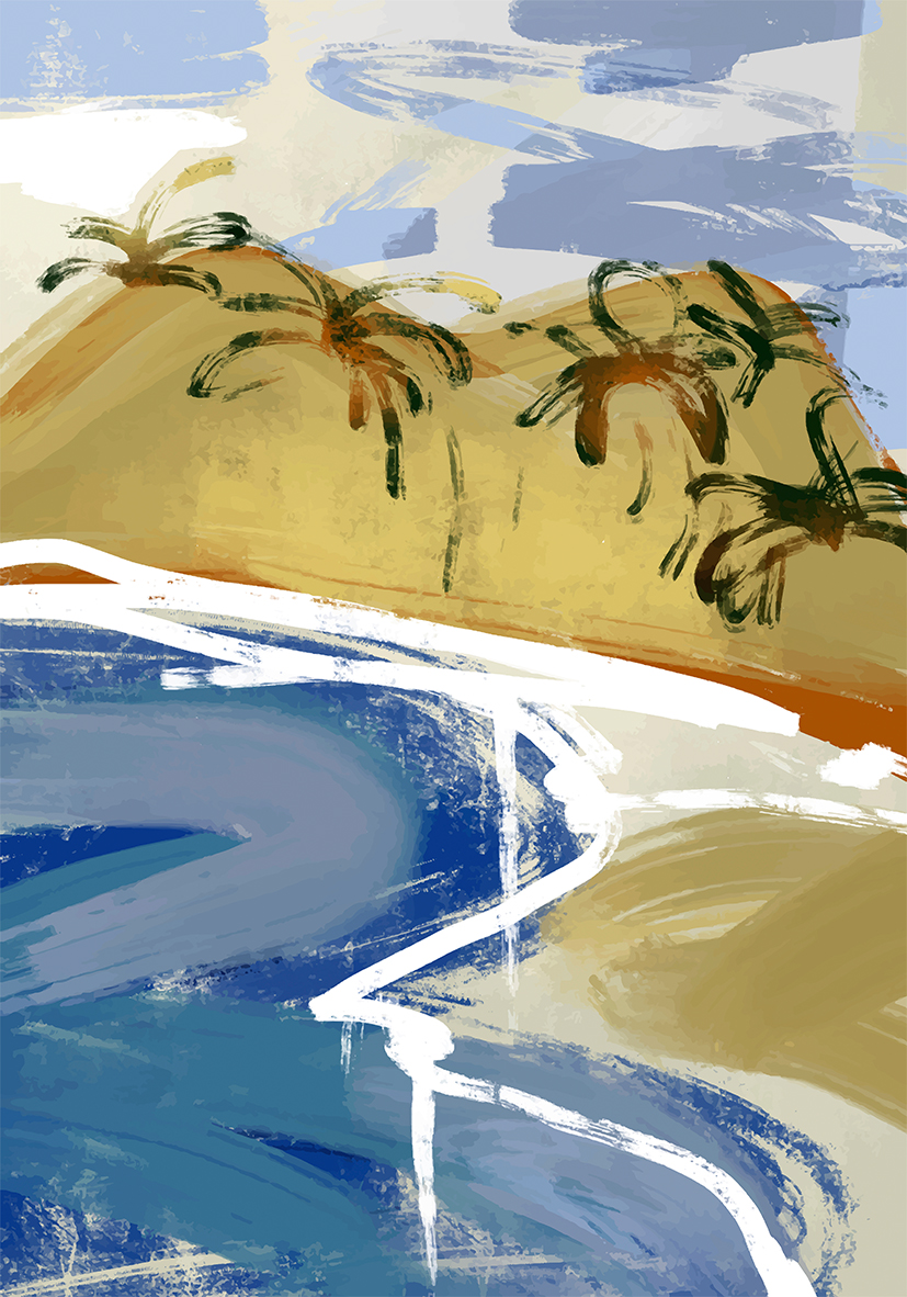 Obra abstracta que representa un paisaje costero sereno con colinas, aguas azules y palmeras estilizadas bajo un cielo nublado. Perfecta para interiores modernos con sensibilidad artística.