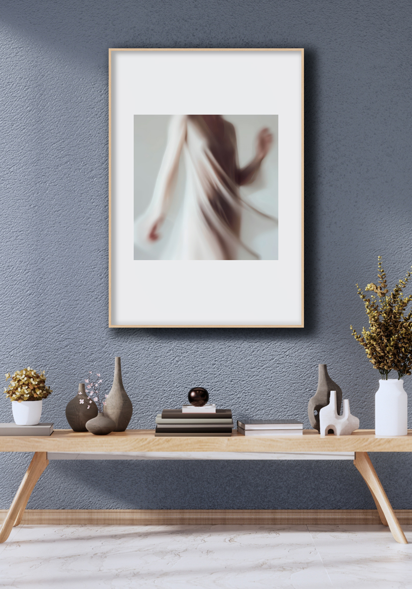 Figura difuminada en movimiento suave, con tonos pastel claros que crean una composición dinámica y elegante. Ideal para ambientes contemporáneos o ilustraciones conceptuales.