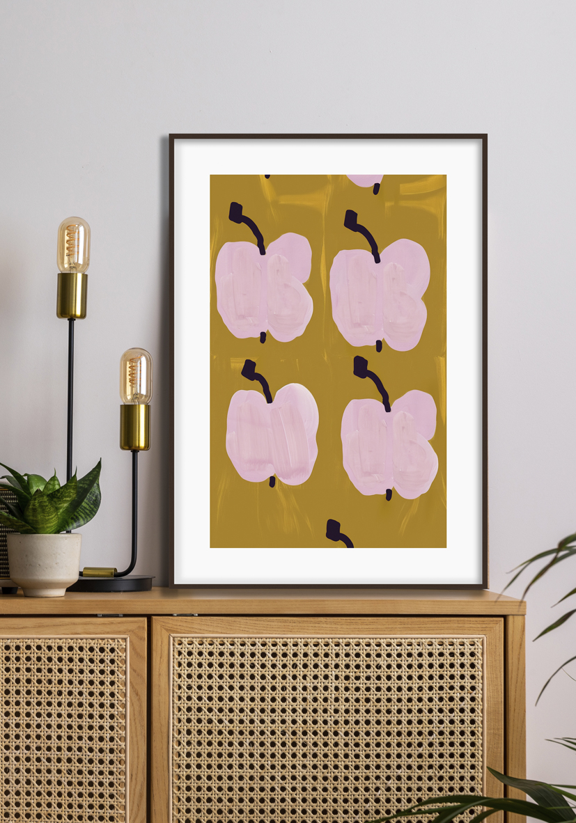 Arte digital con formas estilizadas de manzanas rosas y tallos oscuros sobre fondo mostaza. Diseño simple y colorido, perfecto para decoración contemporánea o amantes del arte.