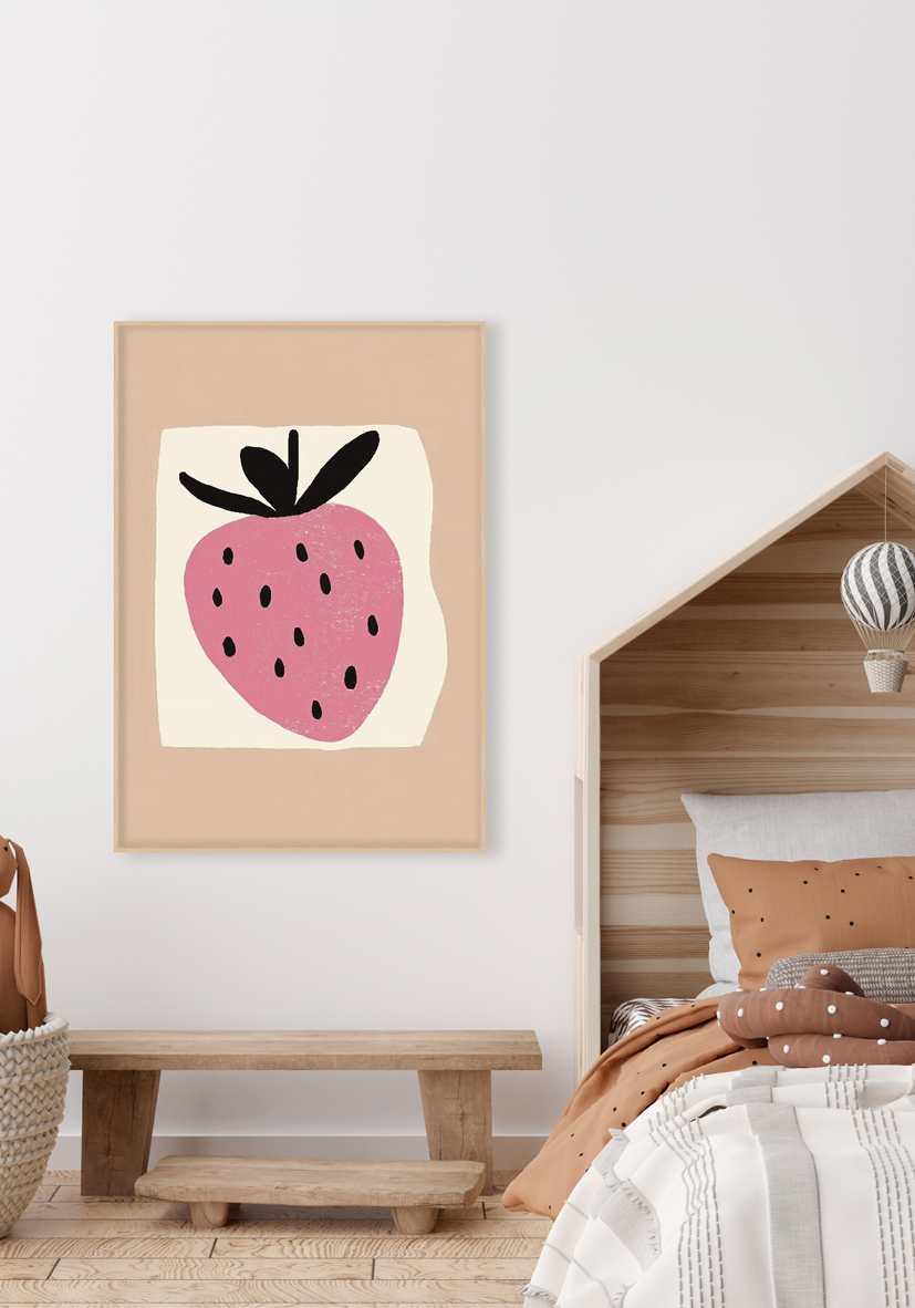 Obra juguetona con diseño estilizado de fresa rosa con semillas negras sobre fondo beige. Ideal para añadir un toque lúdico y minimalista a decoraciones modernas.